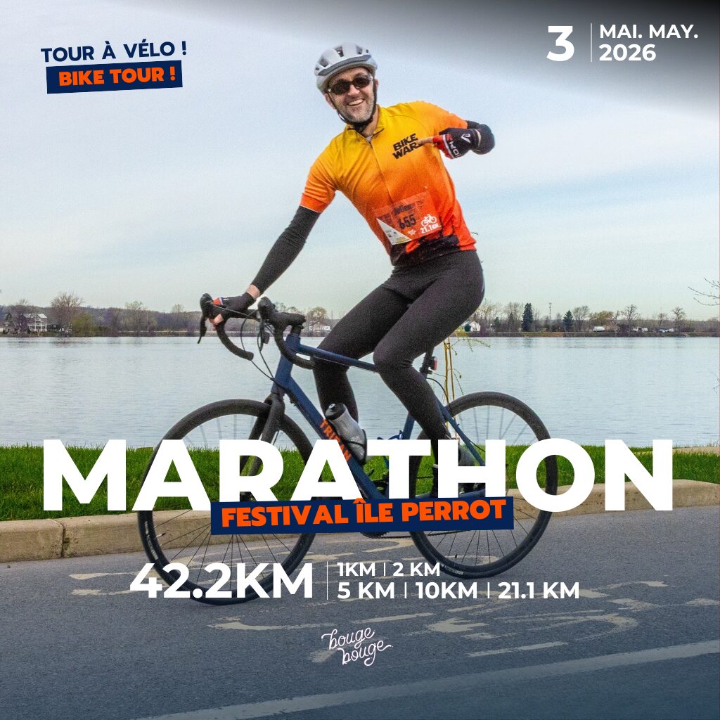 Les municipalités de Pincourt, L’Île-Perrot et Notre-Dame-de-l’Île-Perrot s’ouvrent à vous lors du Festival BougeBouge & Marathon de l’Île Perrot. Participez à une course à pied ou à vélo en famille avec des parcours adaptés à tous, allant de 1 km à 42.2 km. Cette année encore, participez au MÉGA MODO YOGA intérieur! Profitez du printemps et plongez dans une ambiance festive et profitez des activités sportives sur place: spectacles, jeux gonflables, musique, et une variété d’activités animées par des organismes locaux. Un véritable festival sportif, accessible et inclusif pour tous!